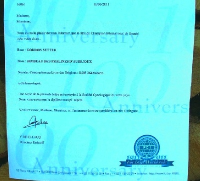 Le titre officiel de Champion International de Beauté = CHIB , cumulant les récompenses en Travail sur le terrain et les récompenses en Beauté = CACIB en France et à l'étranger, est arrivé...
